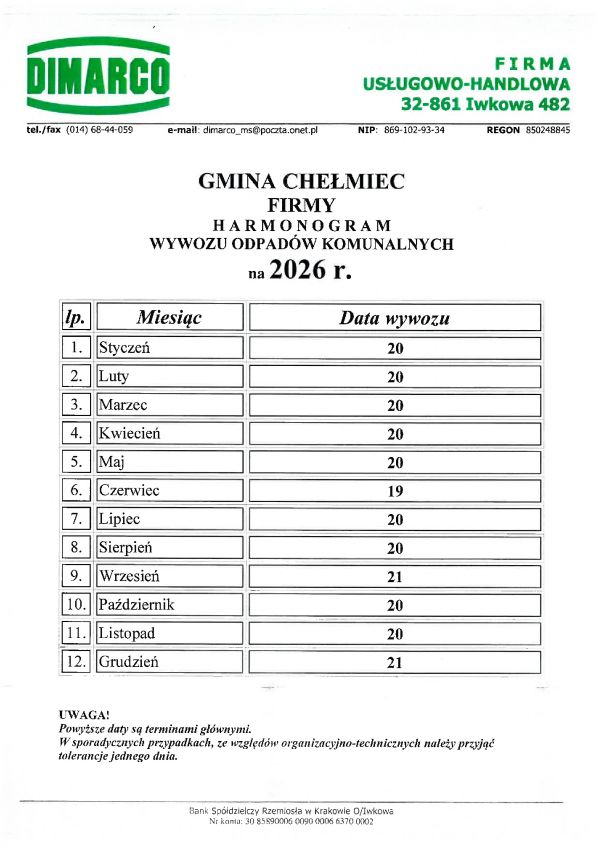 Harmonogram wywozu - Chomranice